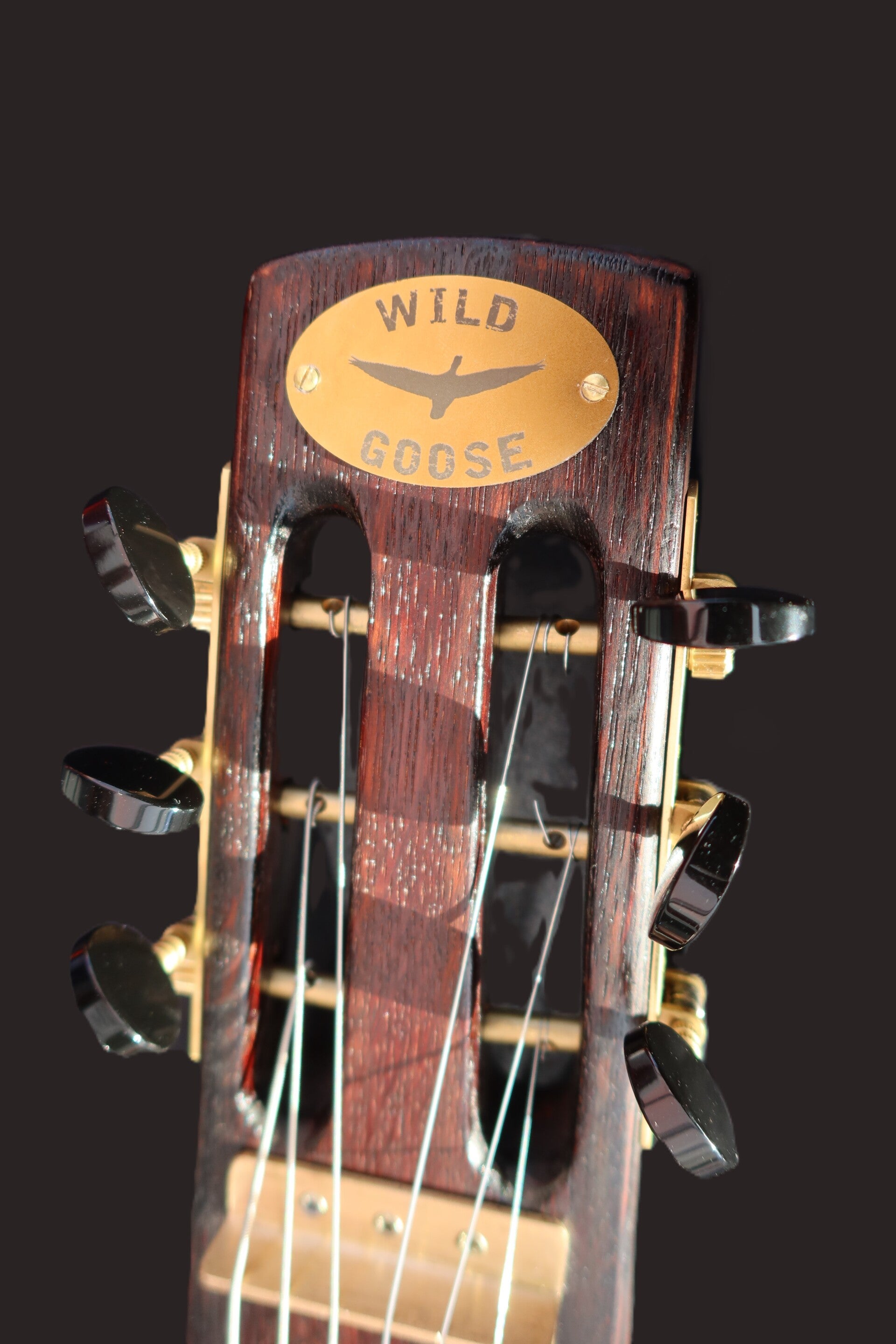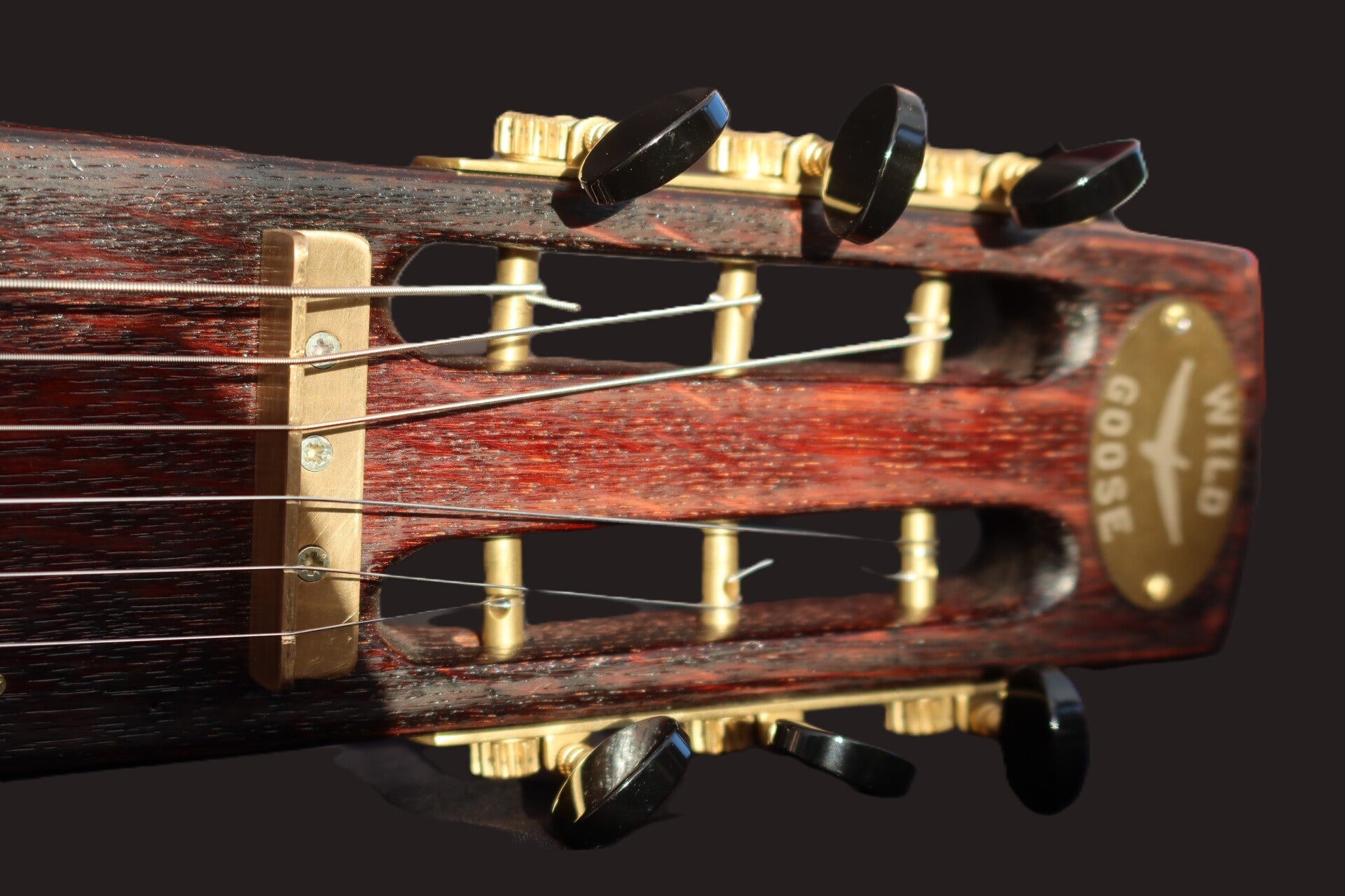 In diesem Sinne sollten auch rustikale Messinghardware und ein Vintage Gold Foil Humbucker aus USA (Guitarfetish) sowie offene, klassische Mechaniken von Rubner (in der einfachen Ausführung überraschend erschwinglich für Made in Germany, und für meine Zwecke super geeignet) für ein überzeugendes und harmonisches Gesamtbild sorgen. Der Sattel ist, wie fast immer, aus einem Messingwinkel selbst erstellt.