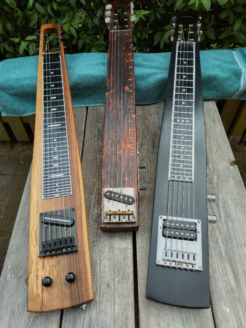 Auf diesen Bildern hat sie nun ihre Bünde und ist noch zwischen ihren großen Schwestern Walnut und Troublemaker, man sieht deutlich den Größenunterschied. Von dem Trio ist nur noch Walnut (die linke der drei) bei mir.
