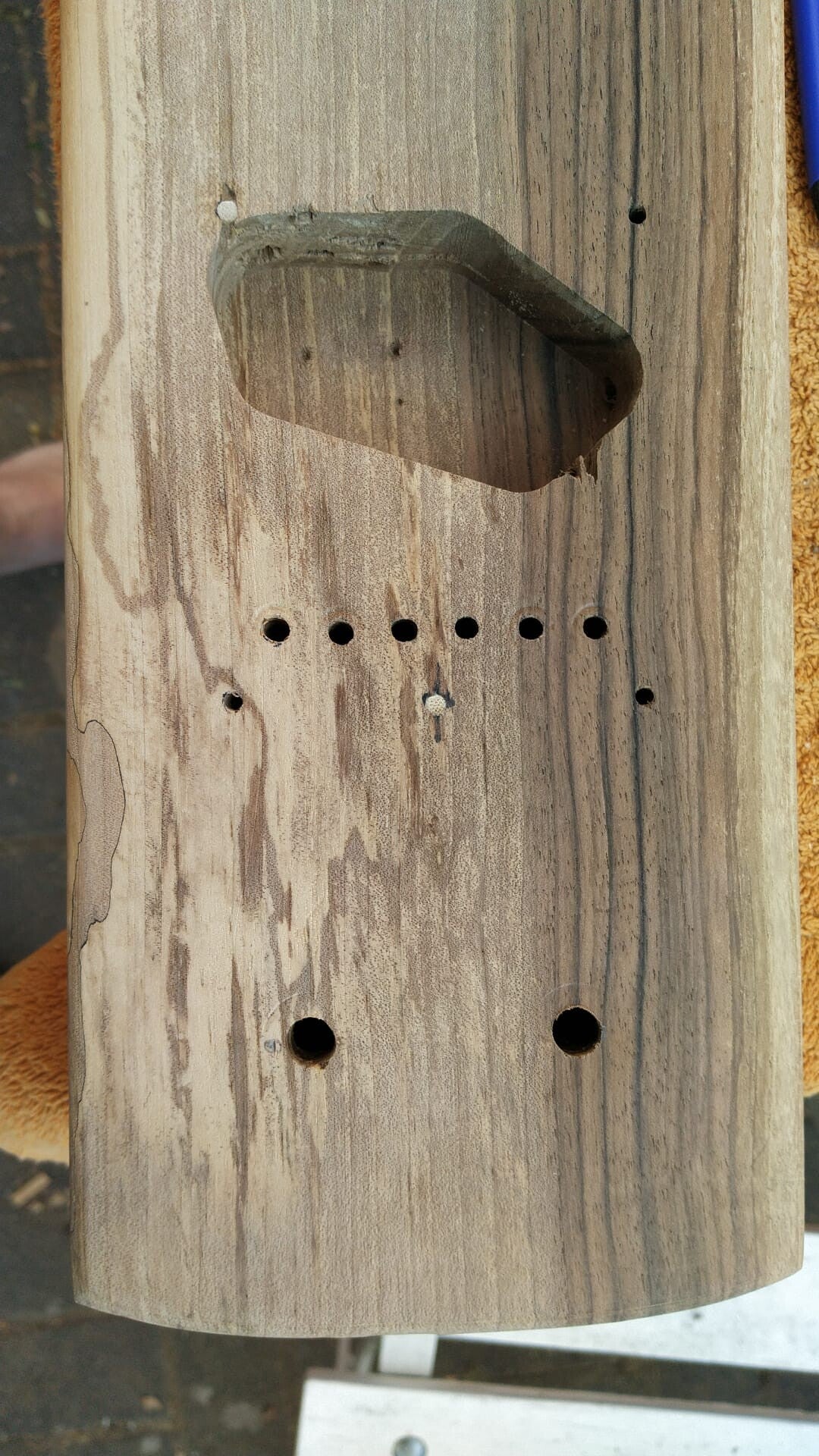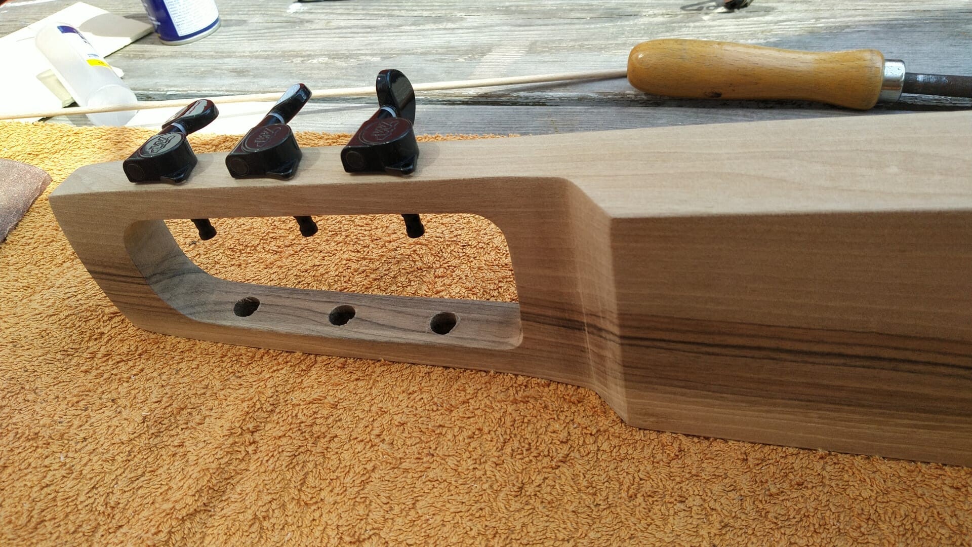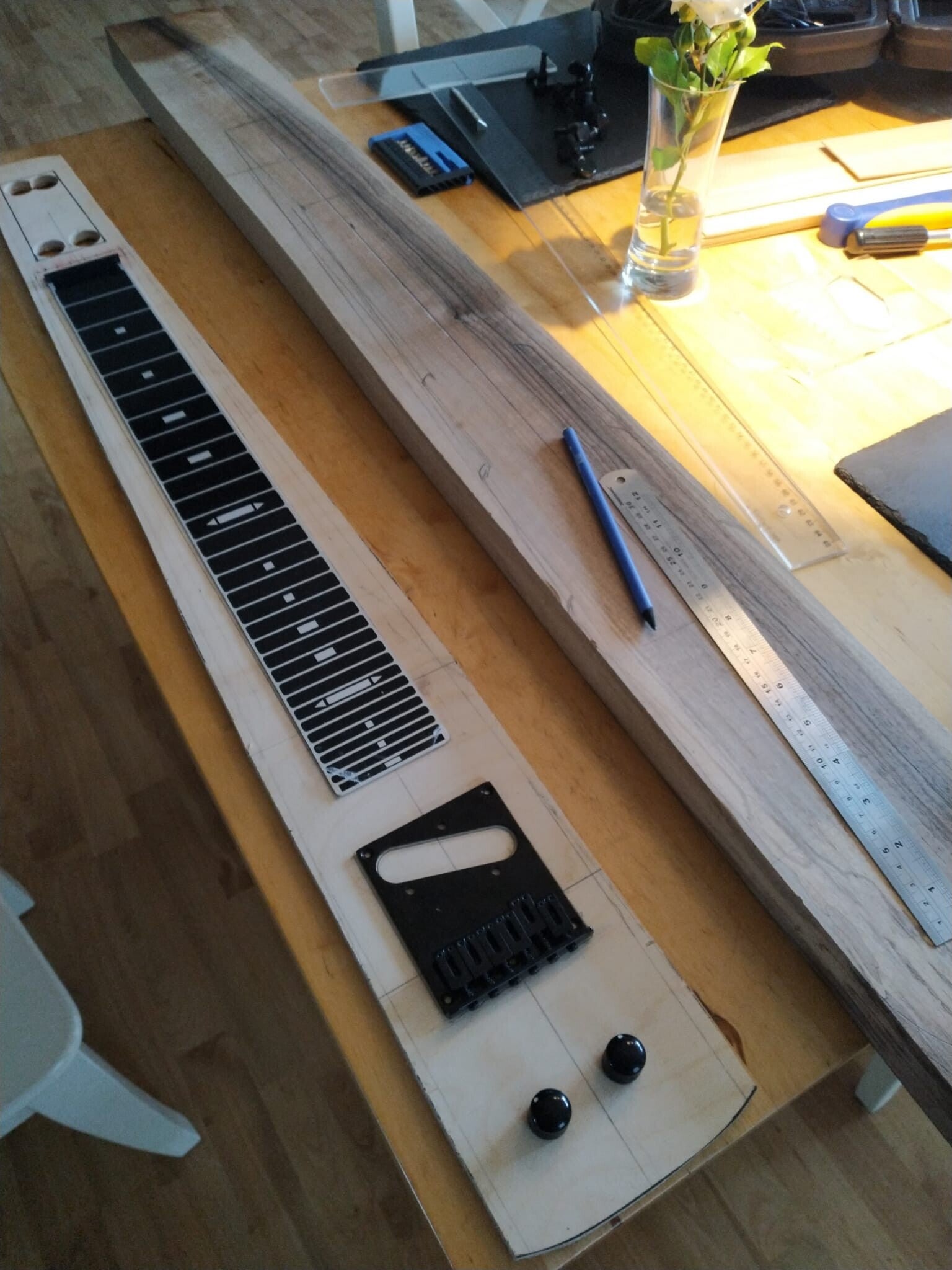 Griffbrett ist aus UK bestellt, aber nach dem Brexit ist das so unsicher (die erste Bestellung hing 6 Wochen beim Zoll und löste sich anschließend offenbar in Luft auf), langwierig und teuer geworden, dass ich meine Griffbretter seitdem selbst herstelle.