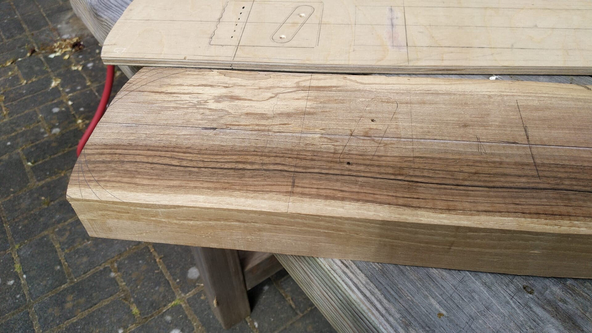 Dem eigentlichen Bau war eine lange Planungs- und Überlegungsphase vorausgegangen, in der ich mir Gedanken über Form, Größe, Design, Technik (Fräsungen, Bohrungen, Kabelverläufe, Schaltung, Elektronik, Mensur, Bundberechnungen u.v.m.) machte.  Dann fertigte ich eine Vorlage aus Sperrholz an, auf der ich Entwürfe bis zum Erreichen des idealen Designs testen und wieder wegradieren konnte, und die mir anschließend als Säge- und Frässchablone (Modell I) diente. Nach vielen Entwürfen in allen möglichen Formen, inspiriert sowohl durch Klassiker als auch durch moderne Modelle und auch Eigenbauten aus aller Welt (merci an Internet und an alle, die ihre Projekte mit der Welt teilen), bin ich immer wieder zum selben Grunddesign zurückgekommen: rank, unverschwurbelt, ab 1/3 der Bodylänge leicht aufeinander zulaufend. Es gibt sehr schöne und interessante Designs auf der Welt, aber keines hat meinen Nerv besser getroffen als das der Porthouse Rocket 6 (altes Design, von dem wohl nur noch ein einziges unscharfes Bild im Net existiert). Klare Linien.