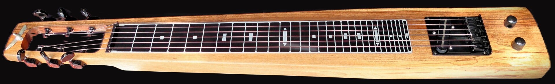 Hardware sind Standardteile (Tuner: Wilkinson, NoName Telecaster Bridge), aber der Pickup ist ein Seymour Duncan Hot Stack, der in der Tele eines Freundes gute Dienste geleistet hatte und sich nunmehr auch an der Lap sehr gut macht.